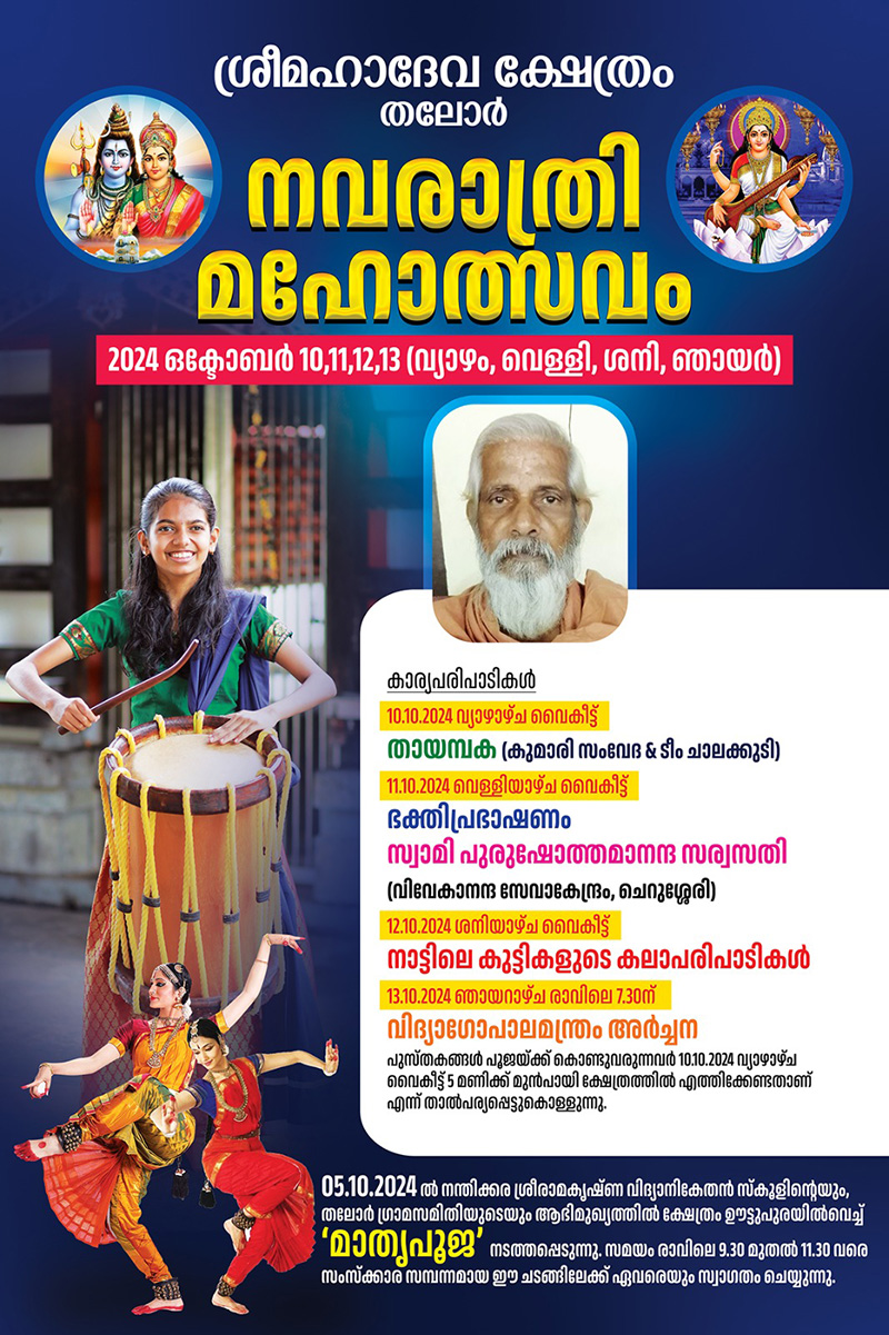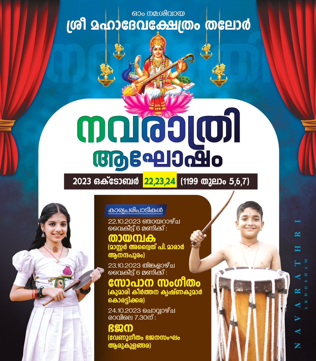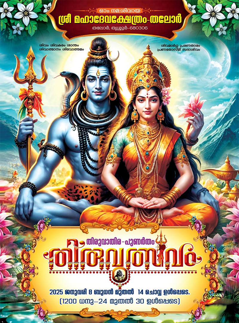 തലോരിന്റെ ഹൃദയഭാഗത്ത് സ്ഥിതി ചെയ്യുന്ന തലോർ ശ്രീമഹാദേവ ക്ഷേത്രത്തിലെ വർഷങ്ങളായി നടന്നുവരുന്ന തിരുവാതിര - പുണർതം തിരുവുത്സവം 1198 ധനു 17 മുതൽ 23 (2023 ജനുവരി 1 -ാം തിയ്യതി ഞായറാഴ്ച മുതൽ 07-ാം തിയ്യതി ശനിയാഴ്ച) ഉൾപ്പടെ 7 ദിവസങ്ങളിലായി ചിട്ടയോടും ഭക്തിനിർഭരമായ ചടങ്ങുകളോടും, കലാസാംസ്കാരിക പരിപാടികളോടും കൂടി ആഘോഷിക്കുവാൻ തീരുമാനിച്ച വിവരം ഏവരേയും സന്തോഷത്തോടുകൂടി അറിയിച്ചുകൊള്ളുന്നു.
