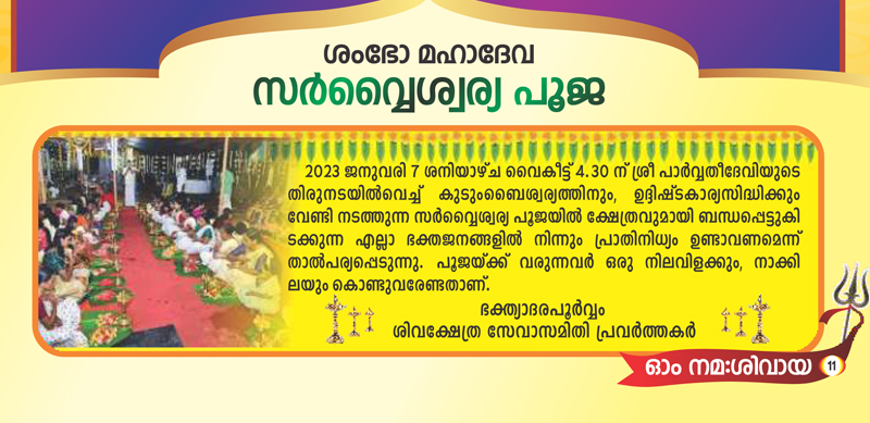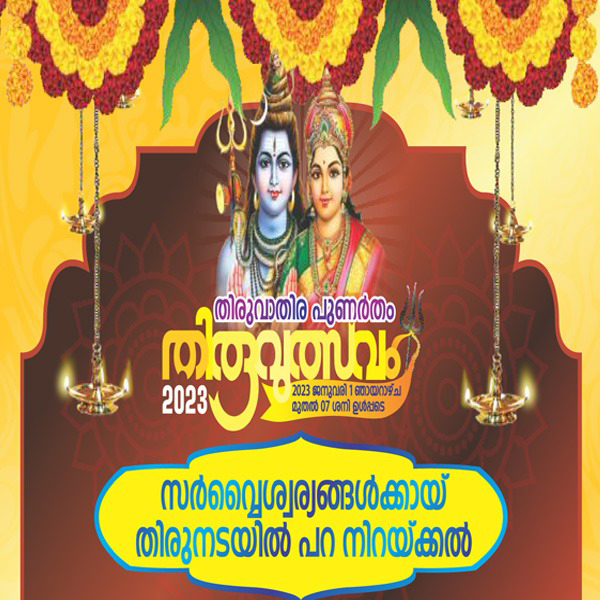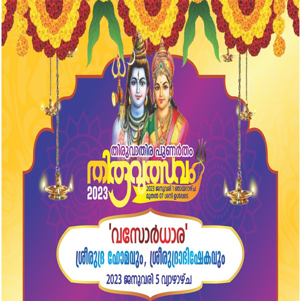 തിരുവാതിര - പുണർതം തിരുവുത്സവത്തോടനുബന്ധിച്ച് 2023 ജനുവരി 5 വ്യാഴാഴ്ച്ച മൂലപെരുമ്പടപ്പ് ദാമോദരൻ നമ്പൂതിരി മുഖ്യകാർമ്മികത്വം വഹിക്കുന്ന വസോർധാര ക്ഷേത്രത്തിൽ നടത്തുന്നു. നാടിന്റെയും നാട്ടുകാരുടെയും സർവൈശ്വര്യങ്ങൾക്കും, കലിയുഗത്തിൽ മാനവരനുഭവിക്കുന്ന സകലവിധ ദുരിതശമനത്തിനും വേണ്ടി നടത്തുന്ന പവിത്രമായ ഈ ചടങ്ങിൽ പങ്കെടുത്ത് അപൂർവ്വാനുഗ്രഹങ്ങൾക്ക് പാത്രീഭൂതരാകണമെന്ന് ഭഗവൽ നാമധേയത്തിൽ അഭ്യർത്ഥിക്കുന്നു.