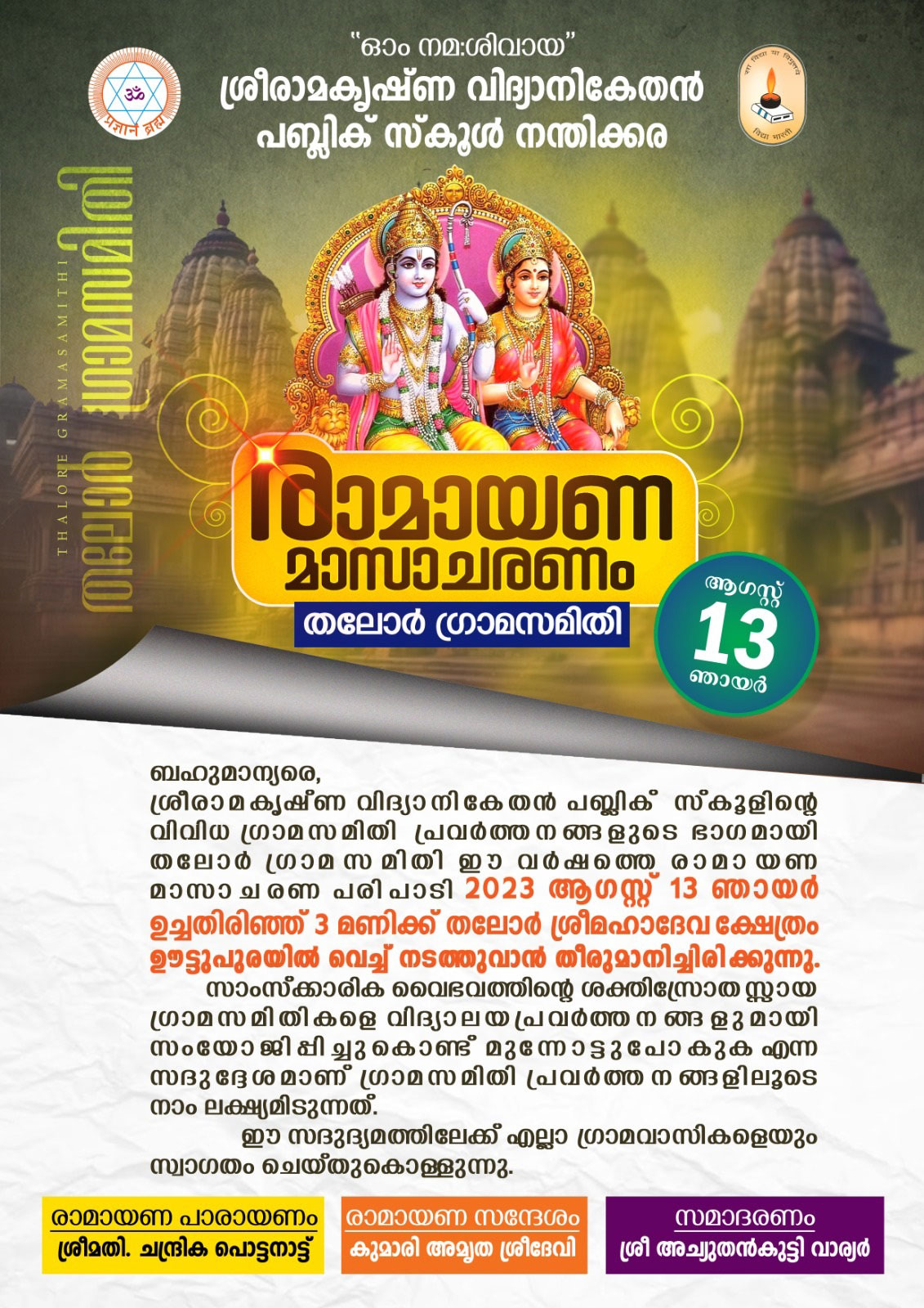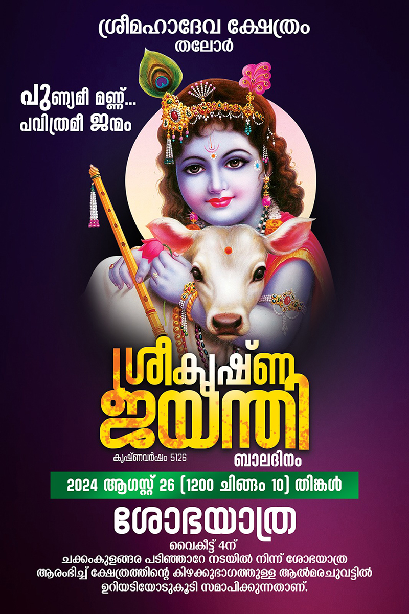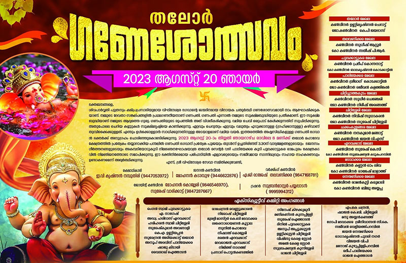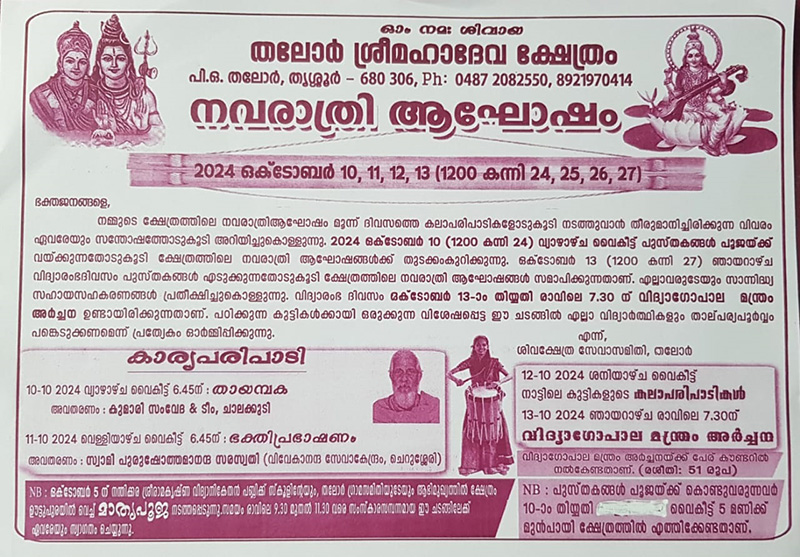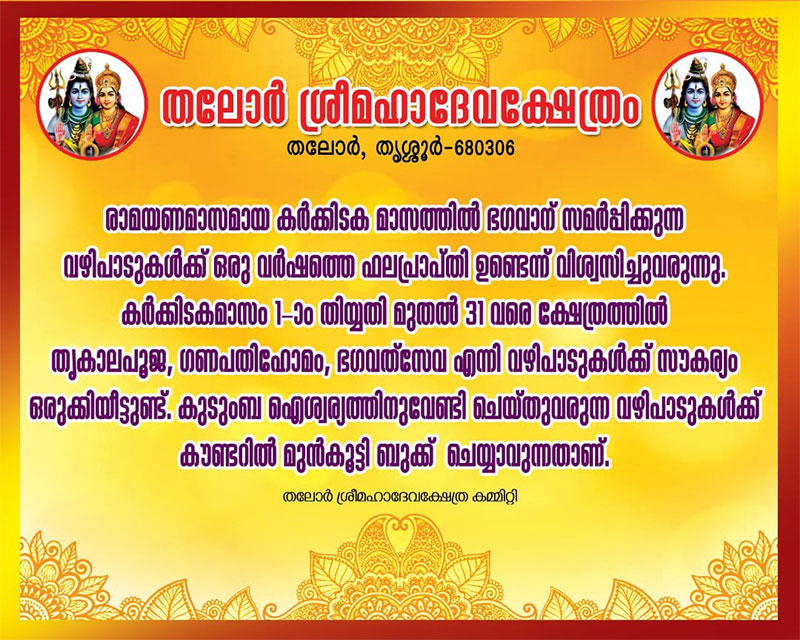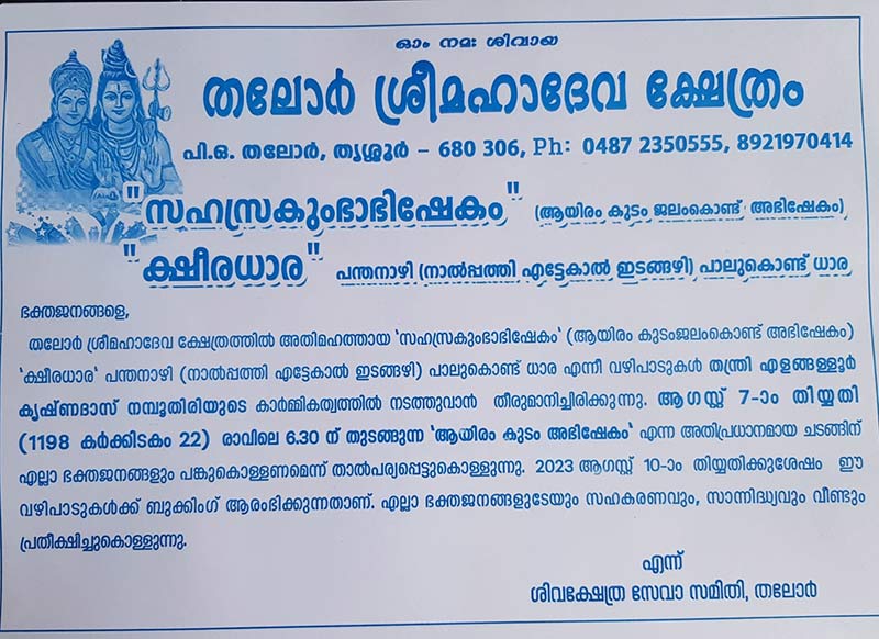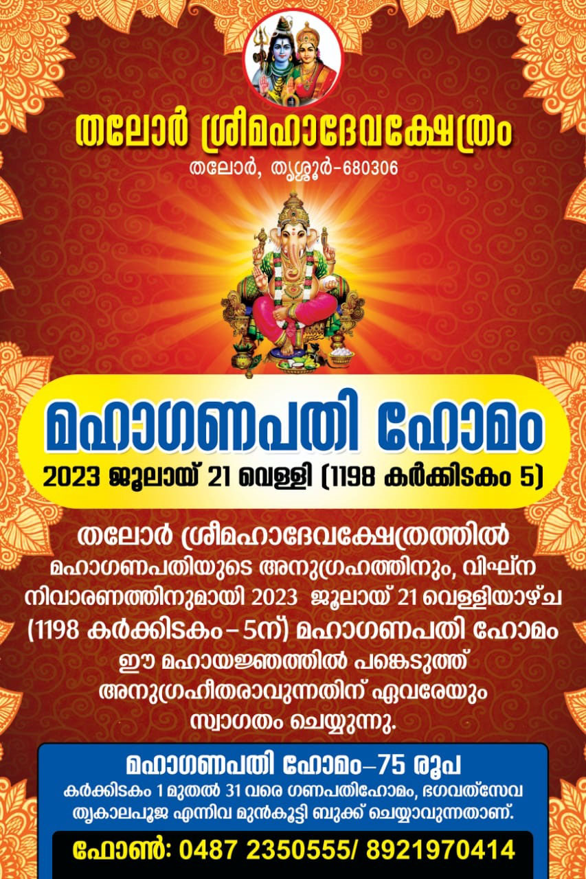 21-07-23 - തലോർ മഹാദേവ ക്ഷേത്രത്തിൽ അഷ്ടദ്രവ്യ മഹാഗണപതി ഹോമം നടന്നു. രാവിലെ ക്ഷേത്രം തന്ത്രി ബ്രഹ്മശ്രീ ഇളങ്ങള്ളൂർ കൃഷ്ണദാസ് നമ്പൂതിരിയുടെ കാർമ്മികത്വത്തിൽ നടന്ന ഭക്തി നിർഭരമായ ചടങ്ങിൽ നിരവധി ഭക്ത ജനങ്ങൾ പങ്കെടുത്തു. ചടങ്ങിൽ ക്ഷേത്രം ഭാരവാഹികളും മാതൃസമിതി അംഗങ്ങളും സന്നിഹിതരായിരുന്നു, തുടർന്ന് പ്രസാദ വിതരണവും നടന്നു.